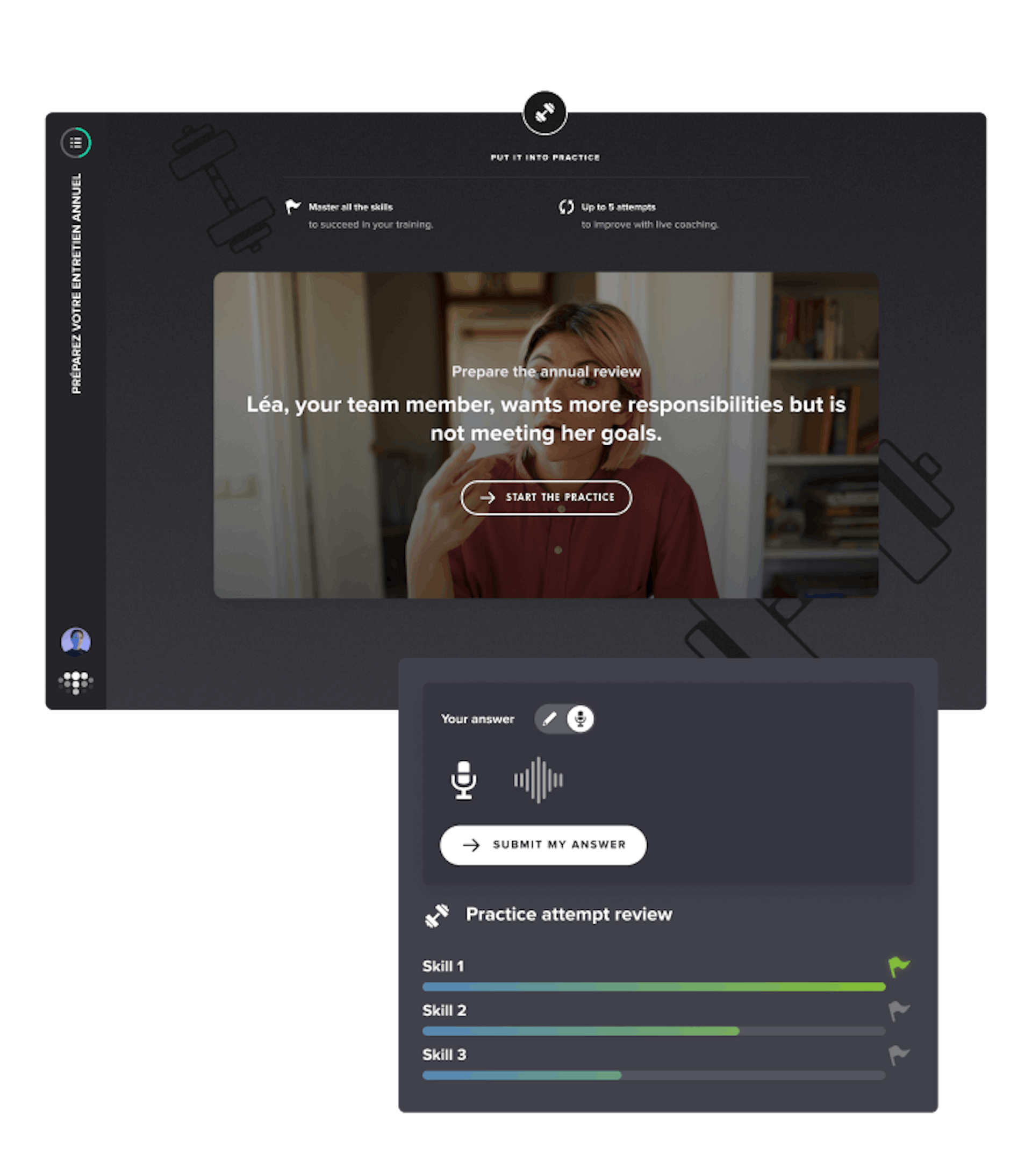 Every session is built from real job scenarios: handling a client objection, writing a complex message, giving feedback to a colleague, pitching a product… Learners practice at their own pace, written or oral, and receive precise feedback to improve with every attempt.