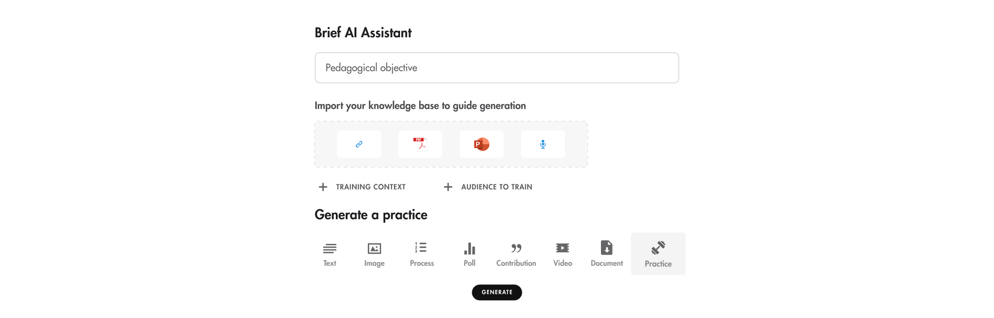 Absolutely. Start with your real-world cases, client calls, manager feedback, product pitches. In under 10 minutes, the AI assistant turns them into tailored practice sessions.