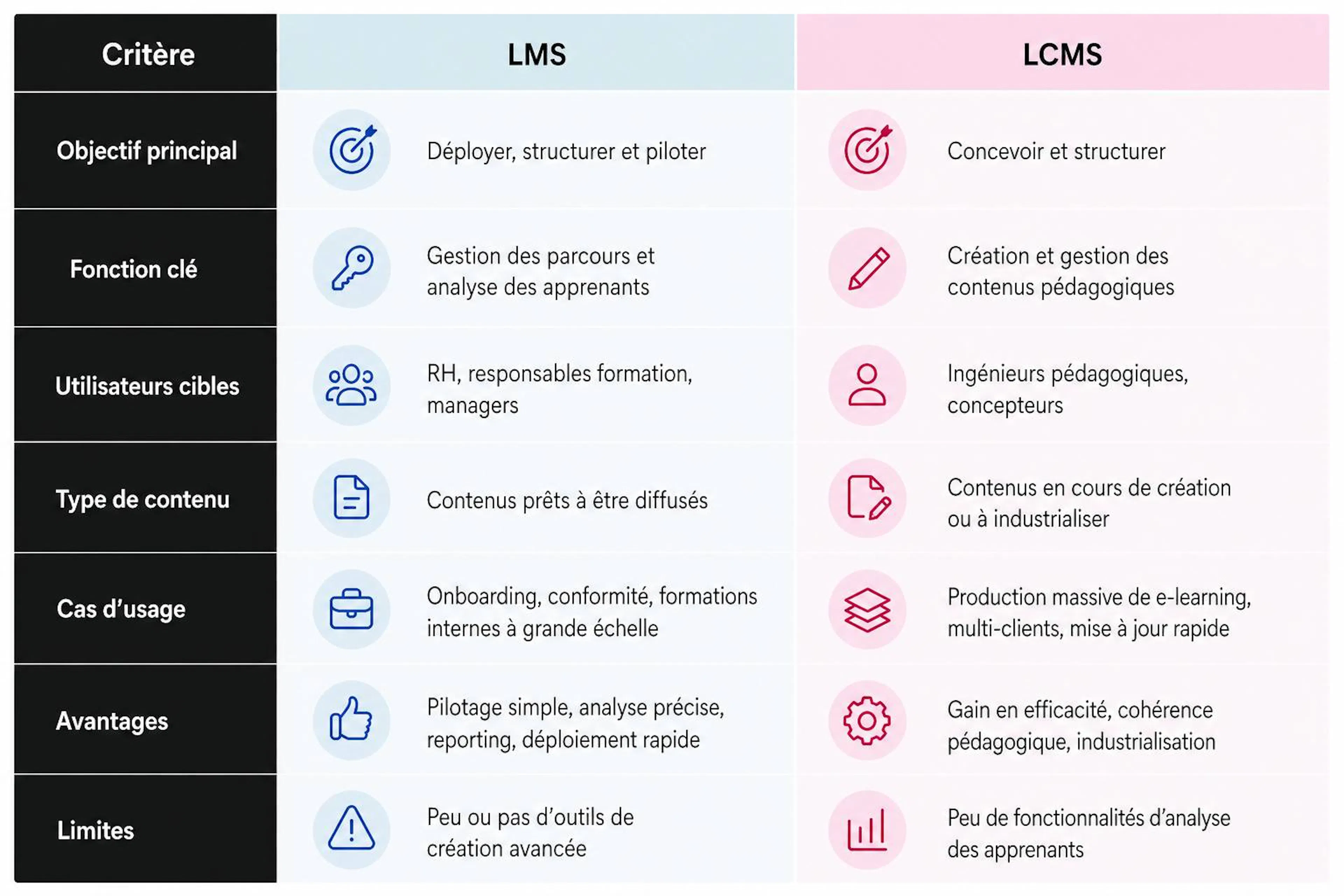 En conclusion : le LMS est plutôt orienté apprentissage et pilotage, tandis que le LCMS est tourné vers la création.