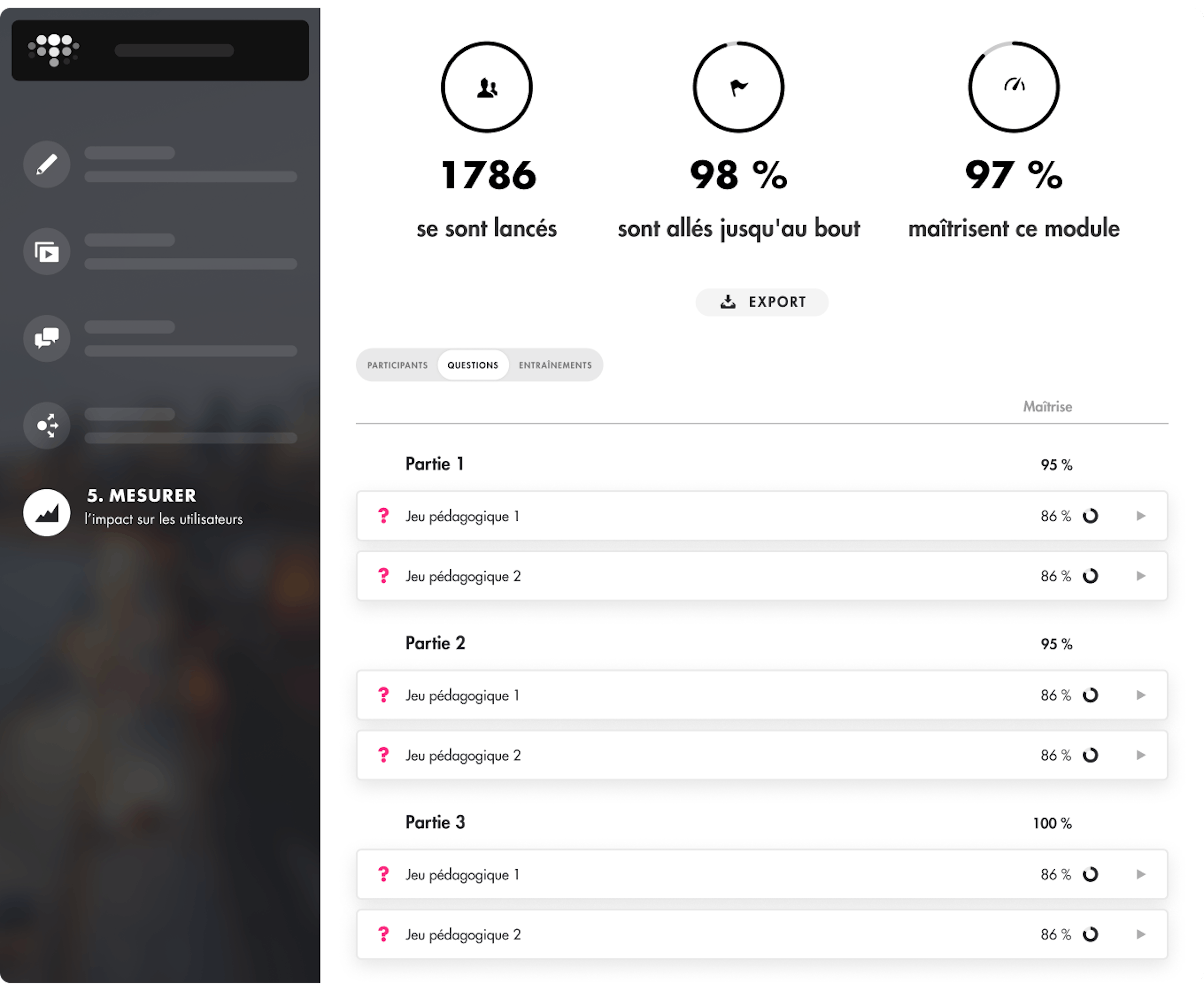 En quelques clics, vous pouvez diffuser vos formations et vos évaluations dans le format de votre choix : lien ouvert, affectation nominative ciblée, paquet SCORM, etc. Grâce aux dashboards personnalisés, vous pouvez suivre la montée en compétences de vos apprenants et récupérer des statistiques sur le niveau de maîtrise des contenus de vos modules afin de les améliorer en continu.