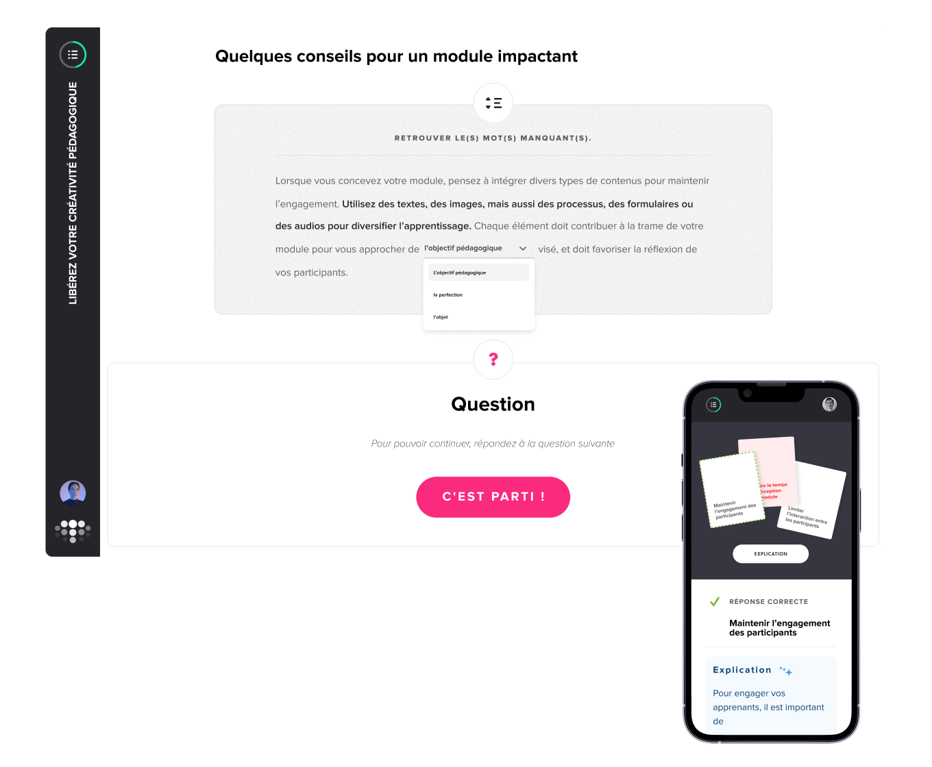 Entre deux sessions synchrones, prolongez l’apprentissage avec des micromodules interactifs qui réveillent la théorie et la transforment en pratique.