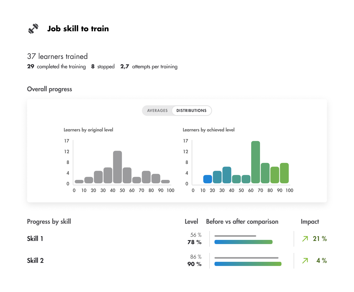 Teach Up gives you detailed dashboards: completion rates, real skill progression, number of attempts, and more. You see exactly what’s improving and what still needs work.