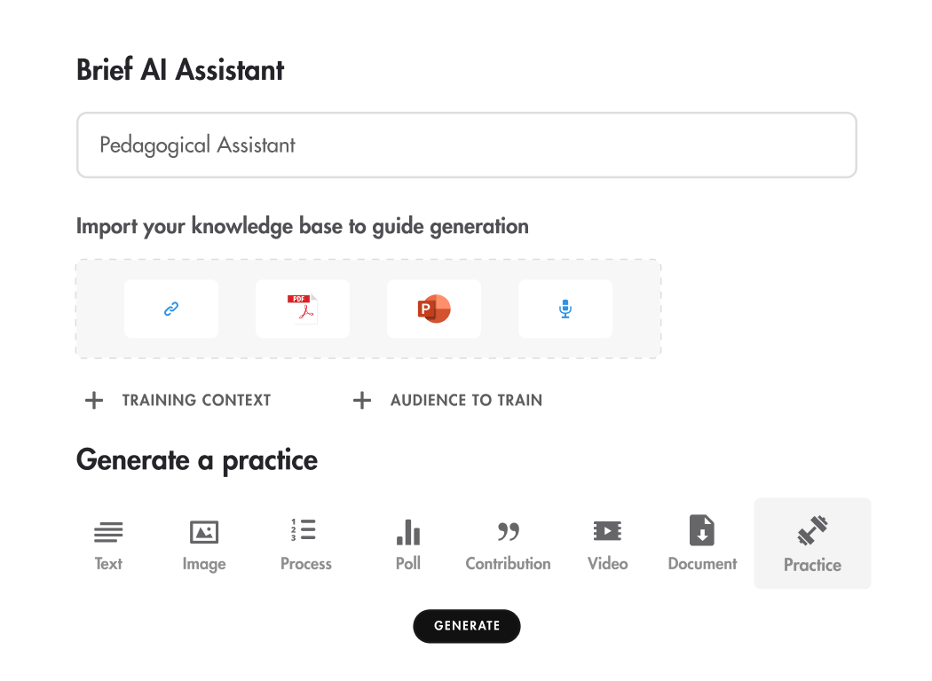 Absolutely. Start with your real-world cases, client calls, manager feedback, product pitches. In under 10 minutes, the AI assistant turns them into tailored practice sessions.