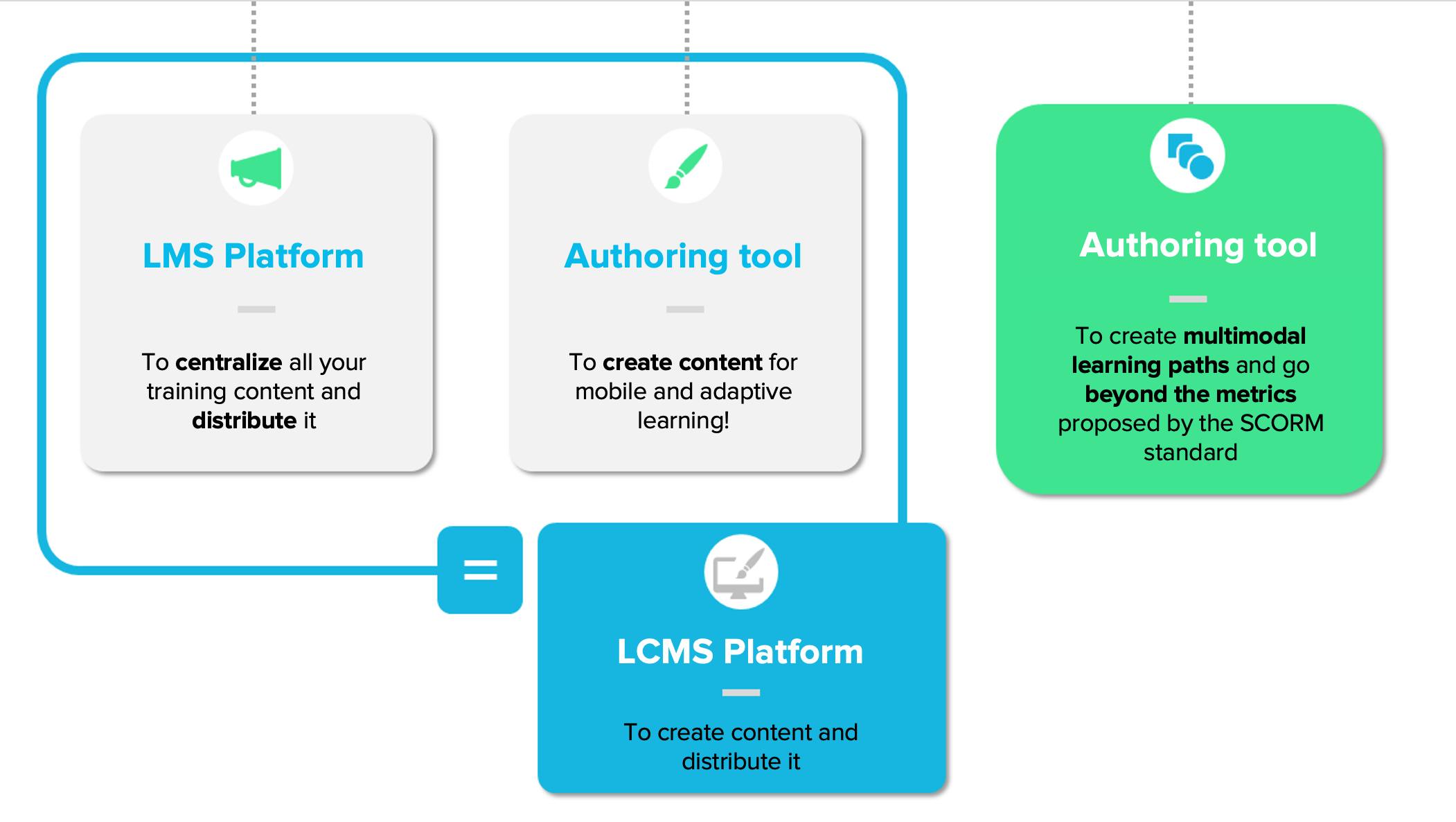 - LCMS: essentially an LMS that also includes an authoring tool. In short: LCMS = LMS + authoring tool.