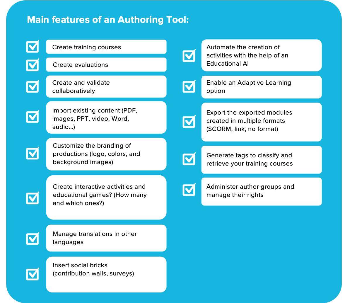 To help you, we’ve put together a checklist of key feature categories for each type of technology: authoring tool, LMS, LCMS, and LXP.