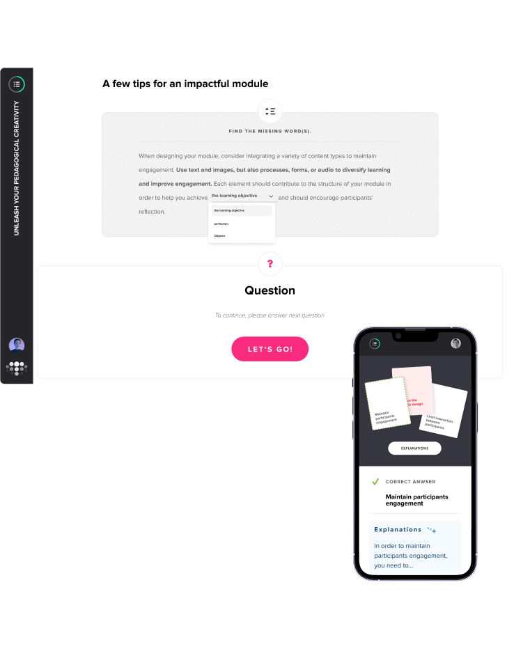 Integrated in the LCMS platform, the creation studio transforms your content into interactive modules ready for distribution. The pedagogical AI assistant guides you through every step of the process: selecting formats, writing content and activities, generating practice exercises, and suggesting alternative explanations. An all‑in‑one studio designed to simplify creation and maximize impact.