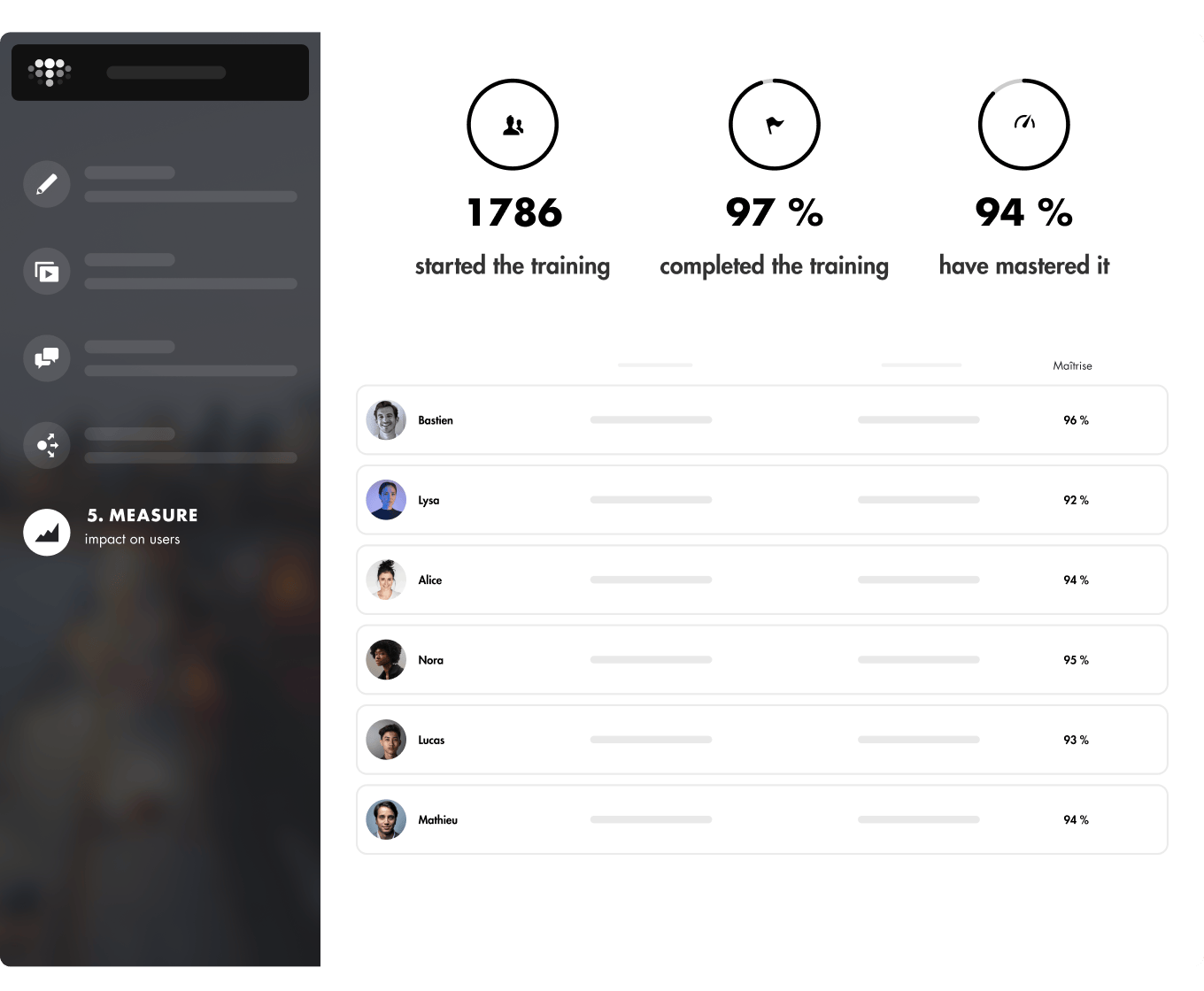 Results are available in real time, with clear, customizable, and exportable dashboards that help you track effectiveness. This enables you to activate the right levers at the right time and continuously improve your learning strategy.