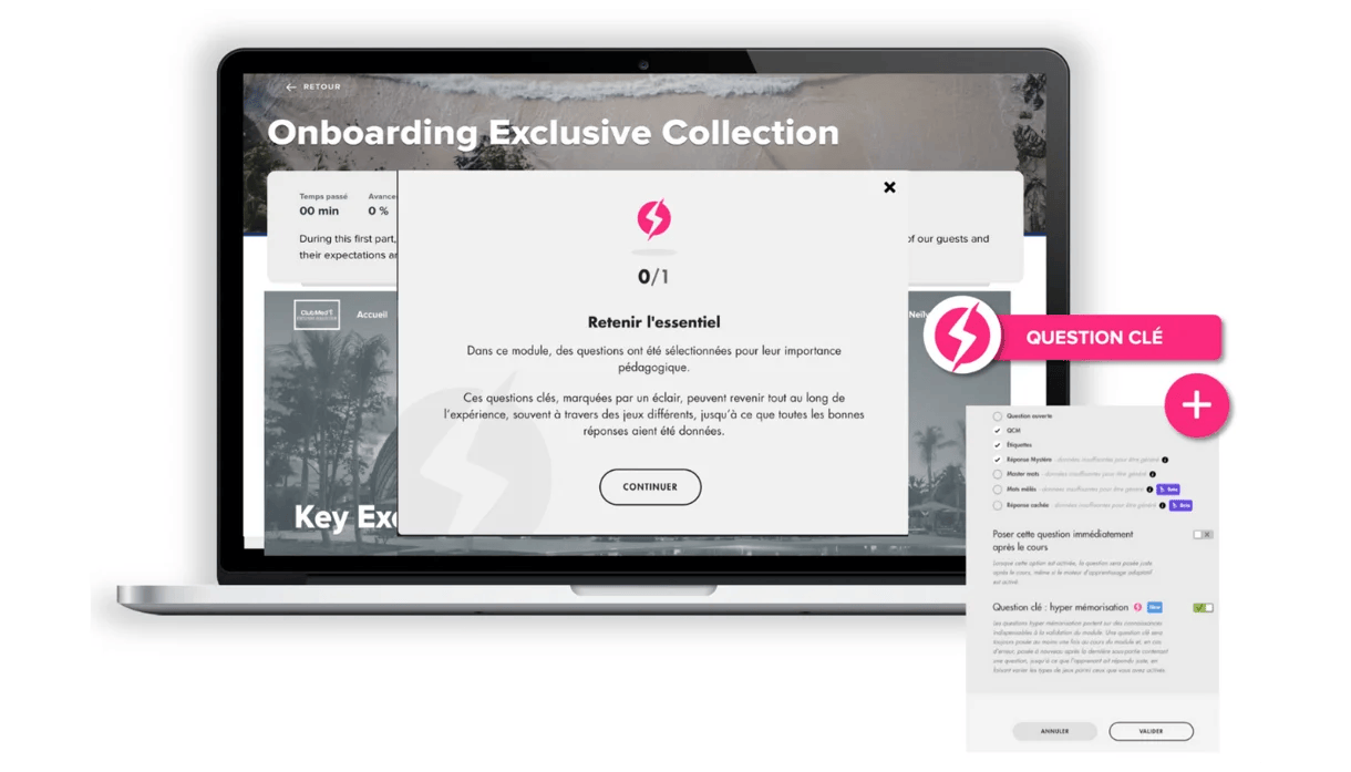 Finally, to boost memorization and maintain attention, you can gamify your training and adapt it in real time to each learner’s level of expertise, thanks to Micro Adaptive Learning. Just highlight the essentials and create key questions—Teach Up, powered by generative AI, takes care of the rest.