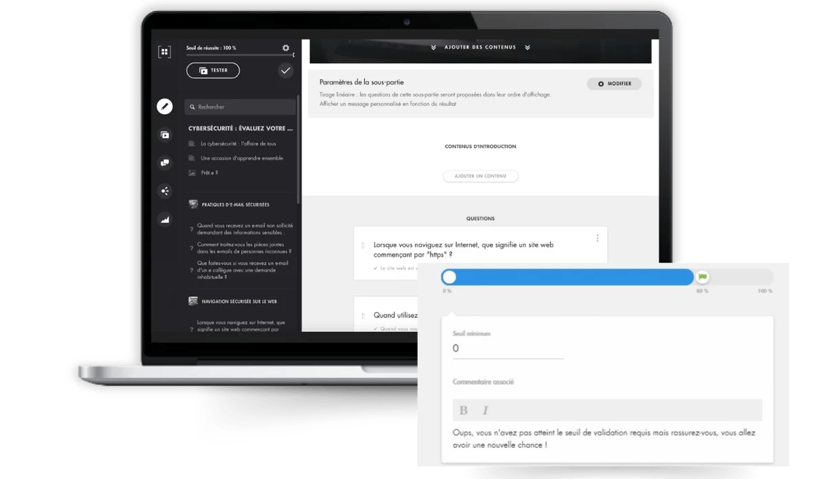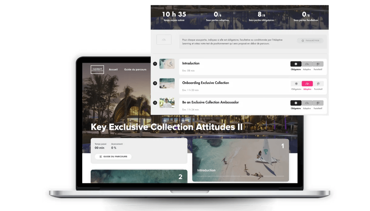 Faced with a huge training organization (200 e-learning modules, 74 workshops, 500 videos, etc.), Macro Adaptive Learning uses a self-assessment test at the start of the path or topic. This determines each learner’s level and guides them accordingly.