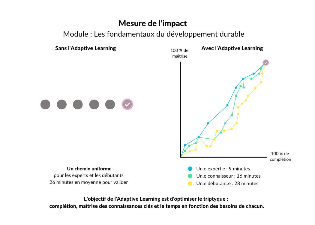 • Macro Adaptive Learning, au niveau d’un parcours de formation avec plusieurs modules. Un test d’auto-positionnement sera proposé en début de parcours pour évaluer la connaissance et les besoins spécifiques de vos collaborateurs. Lors de la formation, seuls les modules utiles leur seront proposés.
